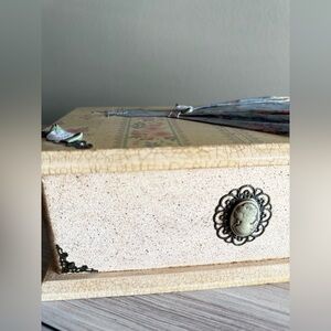 Charming jewelry box with a floral dress design. Features a beige and floral pattern with lace accents.