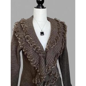 Brown Wool Blend Cardigan with Faux Fur Trim Ruffles!