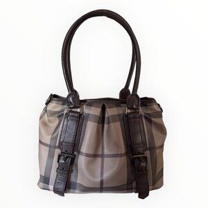 A beautiful Burberry classic featuring the iconic Smoked House Check canvas paired with rich dark brown leather trim and gunmetal hardware. The structured Northfield top handle silhouette is both polished and practical, offering multiple interior compartments and the versatility of both top handles and a removable crossbody strap. Elegant yet easy for everyday wear, this timeless Burberry design pairs effortlessly with both casual and more tailored looks.