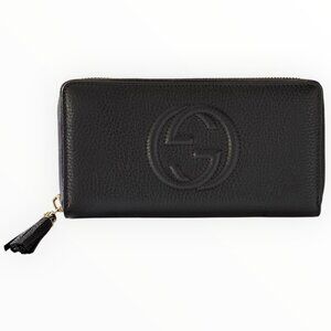 A classic Gucci piece featuring the iconic Soho embossed interlocking GG logo in beautifully grained black leather. This zip-around wallet is both elegant and highly functional, offering generous interior organization while maintaining a sleek, timeless silhouette. Finished with signature gold-tone hardware and the recognizable leather tassel zipper pull, this is one of Gucci’s most loved wallet designs.