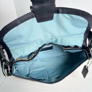 Authentic vintage Coach Soho shoulder bag featuring the iconic patchwork Signature C canvas in warm brown tones with black patent leather trim and silver tone hardware. This classic flap style bag has the signature Soho buckle detail on the front and a beautiful light blue interior lining that gives it a unique contrast. The interior is clean with multiple pockets for organization and the bag holds its shape well. A stylish early 2000s Coach piece that works perfectly as an everyday shoulder bag.
