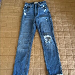 Trendy high rise jeans with a distressed look. Perfect for casual outings. Comfortable and stylish.