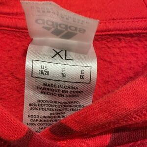 Vibrant red camo pattern. Prominent adidas logo in black. Cozy and trendy design.