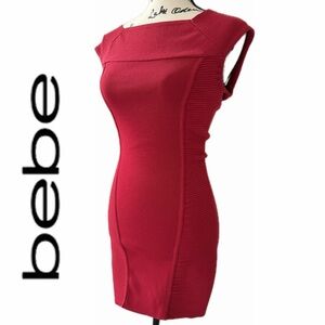 Elegant scarlet mini dress by Bebe. Features a chic bodycon fit.