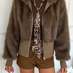 Stay warm and stylish this winter with a khaki faux fur jacket. It has a short length, stand collar, long sleeves, and a zipper placket for a casual, regular fit look.