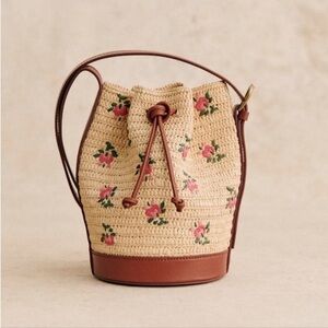 SEZANE MINI FARROW RAPHIA CROSSBODY BUCKET BAG SMALL PINK FLORAL EMBROIDERY