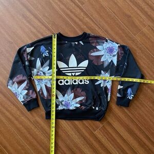 Adidas Originals lotus flower sweatshirt featuring limited edition artwork by Shinpei Naito. Black crewneck with bold floral graphic and a boxy, relaxed fit. Comfy sweatshirt with sporty Y2K streetwear vibes for spring layering.