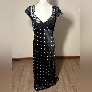 Black satin slip dress with white polka dots, lace bust detail, and a stunning open back with button closures. Romantic and feminine with a vintage-inspired silhouette.