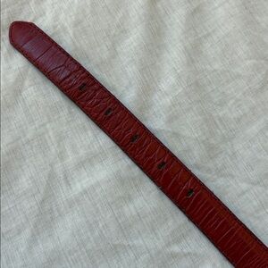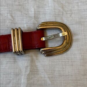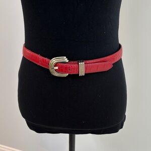 Chic red belt with a sleek gold buckle. Ideal for enhancing any outfit.