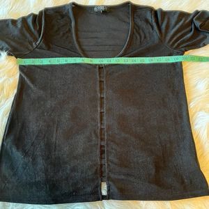 Black Blouse With a slight metallic sheen. Semi-sheer with vertical cutouts down the front.