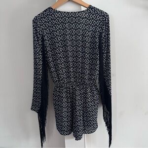 Black and white tribal pattern shorts romper. Fringe hanging from sleeves. V neck with snap button closure at chest. Elastic at waist. Lightweight material. Pockets at hips.