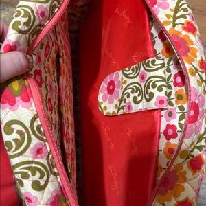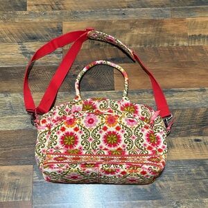 Charming floral baby bag by Vera Bradley. Features vibrant red straps. Ideal for stylish moms.