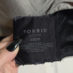 126 Torrid 44DD Gray Black Sports Bra with Green Accents Callouts Dark Spot and normal wear