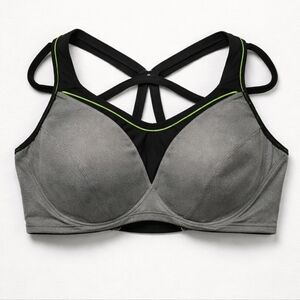 Stylish sports bra with supportive design. Features gray and black with green accents. Ideal for active wear.