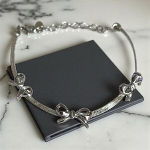Elegant silver bracelet with bow accents. Perfect for any occasion.
