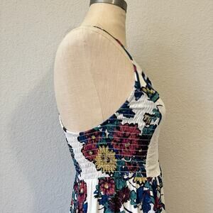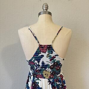 The INTIMATELY FREE PEOPLE Through The Vine Maxi Dress in women's size M features a floral pattern with a V-neckline and sleeveless design. Made of rayon fabric with a pullover closure, this dress is perfect for various occasions such as travel, parties, or casual outings. The dress is adorned with straps, smocked detailing, and a side slit, adding a touch of bohemian style to the colorful and vibrant design. Ideal for summer, fall, and spring, this dress is machine washable and designed for a fit and flare silhouette, making it a stylish choice for women looking for a statement piece.
