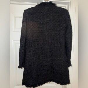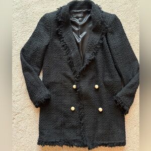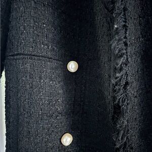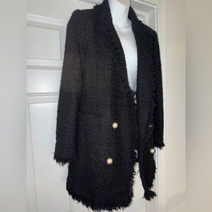 Zara Women's Frayed Tweed Boucle Blazer Jacket with Pearl Buttons, Size Small. Such an attractive style, this Zara black textured weave woven jacket, notable for its double-breasted look but doesnt close and pearl button accents is often described as "Chanel-inspired." It features a distinct frayed or fringed trim along the lapels, cuffs, and hem. Four large pearl buttons on the front. Piped front pockets still welted. Elevate your wardrobe with this stunning Zara Women's jacket. Crafted from high quality cotton, this jacket features a textured tweed like weave and pearl button detail for a chic and sophisticated look. Buttons are for design only since jacket stays open. This jacket is perfect for any occasion, whether its a night out with friends or a formal event. this jacket is tailored to a women's size Small and has a regular fit. The lining is made of cotton ensuring maximum comfort and breathability. This basic jacket is a must-have in any fashion forward women's wardrobe. Excellent used condition. Expect compliments!! Approximate measurements laying flat: 19.5” pit to pit, 31” length, 23” sleeve length.