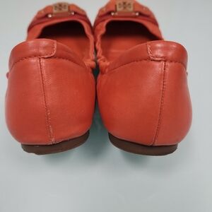 Chic orange flats with signature gold logo. Stylish and comfortable for everyday wear. Good condition but used. Some scratches but not obvious when you wear it, still looking great. Gourgeus and chic ✨️ 😍 💕 lam selling a orange Tory Burch Bag just in case you want to match it.