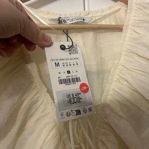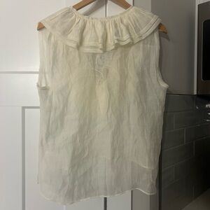 Chic cream blouse with ruffled neckline. Lightweight and stylish. Perfect for versatile wear.