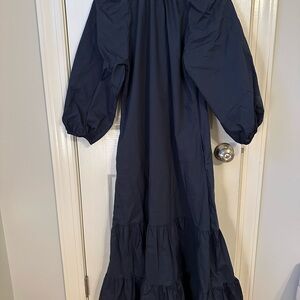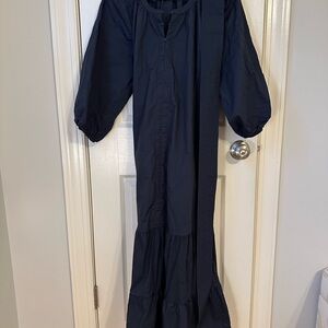 Elegant navy maxi dress. Features a tie waist and three-quarter sleeves. Perfect for any occasion.