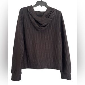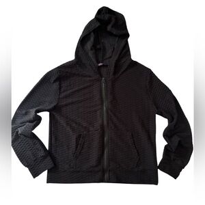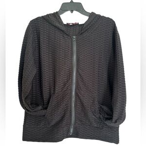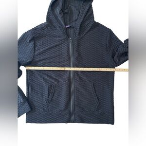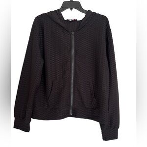 Women's full zip Black Textured waffled Jacket AQ Sports 2X lightweight with hood and pockets. Stay stylish and comfortable with this black textured jacket. Perfect for any occasion, this jacket adds a touch of elegance to your wardrobe.