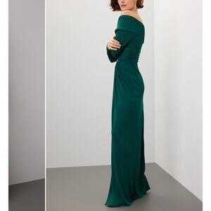Sophisticated designer gown in a slimming thick jersey fabric elegant off the shoulder detail, high front slit, long fitted sleeves, fully lined, light ruching in the right places to flatter your curves