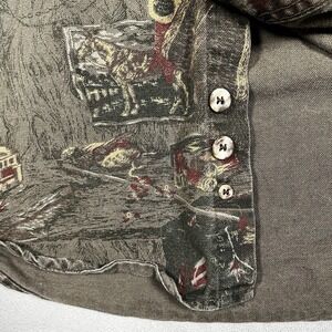 The Vintage Eddie Bauer Men's L Elkhorn Canvas Shirt is a classic piece of clothing perfect for casual occasions in the winter, fall, or spring. This button-up shirt features a collared neckline, spread collar style, and long sleeves, providing a comfortable fit for everyday wear. Made of cotton with a graphic print pattern, this shirt showcases the brand's heritage with a retro hunting, fishing, and outdoor-themed design, ideal for those who appreciate a rugged and nature-inspired look. With its machine washable fabric and durable construction, this shirt is a timeless addition to any wardrobe.