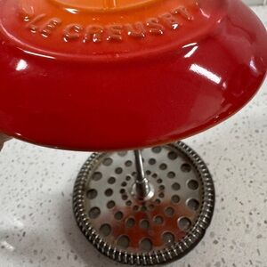 Elevate your coffee experience with this vibrant LeCreuset color flame French press. Enjoy bold flavors and a stylish design. Like new condition.