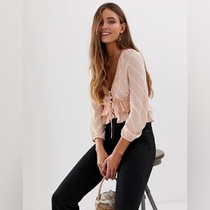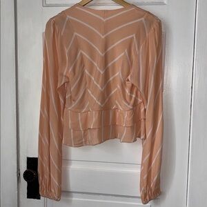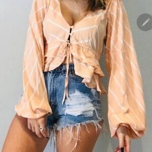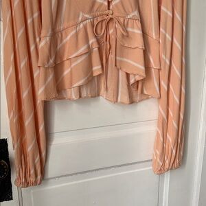 Free People Samifran striped top. Cropped and button front with string tie. Flowy balloon sleeves and tiered ruffle trim. Peachy orange and white.