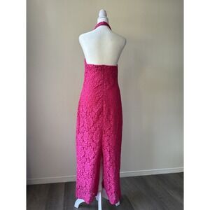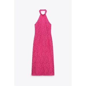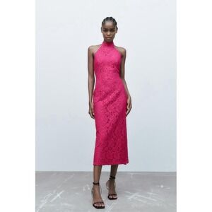Zara Lace Halter Dress Womens Medium Pink Fuchsia Midi Floral Open Back Pencil