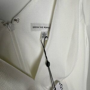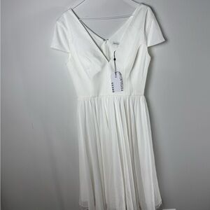 Brand new with tags Dress the Population Corey chiffon fit and flare midi dress in Off White. This feminine cocktail dress features a flattering V-neckline, cap sleeves, and a softly gathered chiffon skirt with subtle movement through the hem. Perfect for bridal events, engagement photos, rehearsal dinners, or elegant wedding guest occasions.