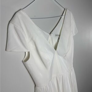 Dress the Population Corey chiffon fit & flare midi dress in off white. V-neck cap sleeve cocktail dress, size L. Classic graduation dress.