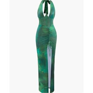 Micas Green Halter Maxi Dress Ruched Slit Bodycon Party Cocktail Evening XL