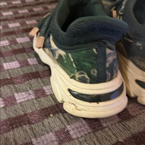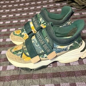 Stylish Dior sneakers with a vibrant green and yellow pattern. Features comfortable straps and a unique design.
