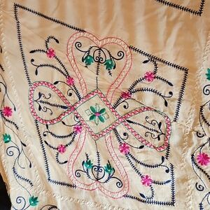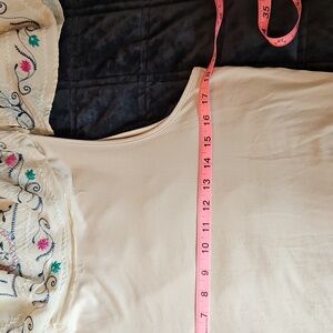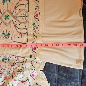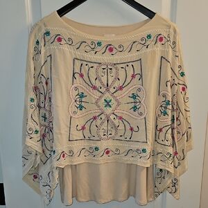 Channel your inner free spirit with this gorgeous cream-colored embroidered top. It features an airy, tiered caftan silhouette with intricate floral embroidery in vibrant pink, teal, and navy. If you love the Free People Frida dress, this is the top version you’ve been looking for!
