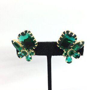 VINTAGE EMERALD Rhinestone Brooch Earring Set Green Glass Prong Clip on MCM