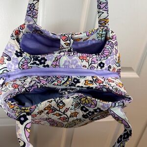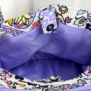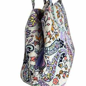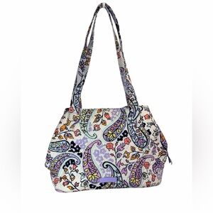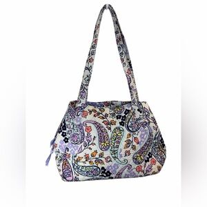 Iconic Vera Bradley satchel in a discontinued Maddalena Paisley Soft print with purple, lavender, and white paisley on quilted cotton. Roomy hobo style with zip top, exterior slip pocket, interior pockets, double shoulder straps, and flat base—machine washable.