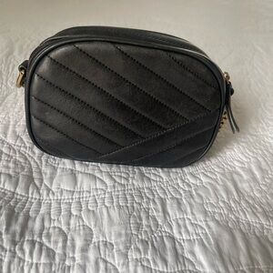 Stylish crossbody bag by Tory Burch. Features quilted black design. Gold chain strap adds elegance.