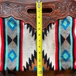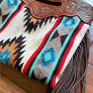 Embrace a bohemian vibe with this stylish crossbody bag. Featuring a vibrant pattern with brown leather accents and fringe details, it's perfect for adding a unique touch to any outfit.