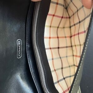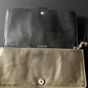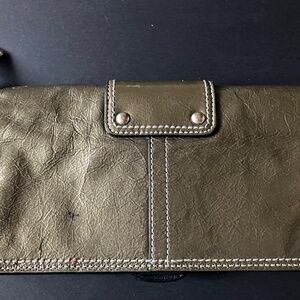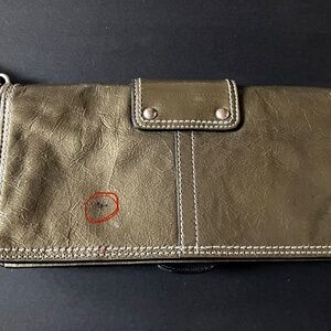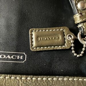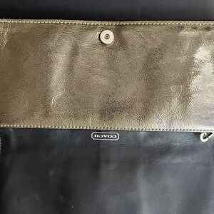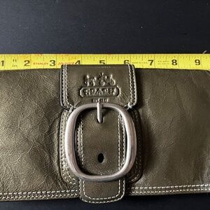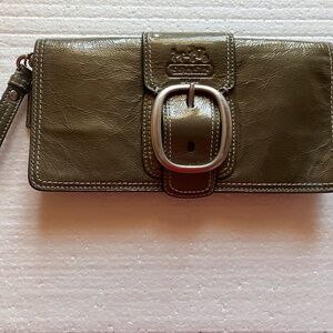 Vintage Coach Bleecker clutch accordion wallet in crushed gray patent leather with classic Y2K buckle detail and removable 6” wristlet strap. Magnetic snap closure with interior zip compartment. Silver-tone hardware. Features Coach hangtag. Interior includes front pocket, center zippered pocket, large back compartment with 6 card slots with a slip pocket. 9”Lx4.5”Hx2”D. Original owner. Non-smoking/no pet storage. Note: there is a small ink spot on the back (see photo w/red circle). There is some minor wear consistent with vintage use. Let me know if you have any questions.