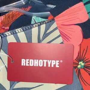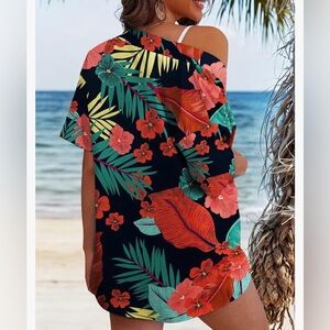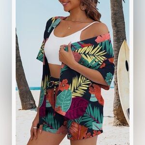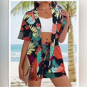 Vibrant tropical 2 piece Kimono short set. Features red, green, and yellow leaf and flower patterns.