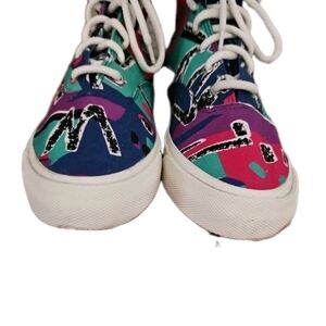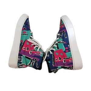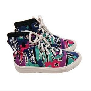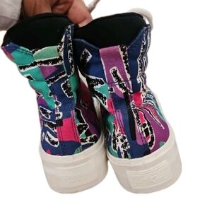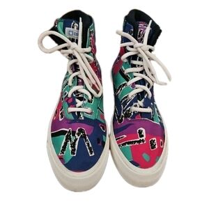 The Converse Skid Grip Hi Fear Of God features a Limoges, Egret, and Simply Green canvas upper, with the entire upper covered in an archival print pattern that includes shades of black, white, blue, red, purple, and the greenish-blue of Limoges in various patterns throughout the material. From there, a thick rubber sole done in the white completes the design.