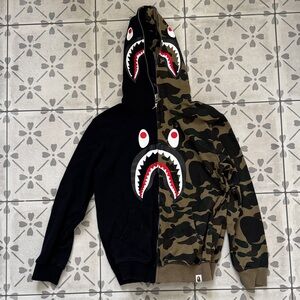 Unique split hoodie with shark face design. Features black and camo colors. Very good condition. Size M.