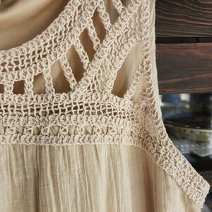 This elegant cream midi dress features intricate crochet detailing, perfect for any occasion. Add a touch of sophistication to your wardrobe with this versatile piece.