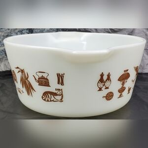 The Pyrex Vintage Early American 1.5 qt Cinderella Round Casserole Dish 474-B is a classic and durable piece of American-made cookware. This covered dish features a round shape and a rich brown color, perfect for serving and storing a variety of dishes. Made of high-quality glass, this Pyrex casserole dish is a stylish and practical addition to any kitchen collection.
