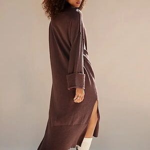 This midi dress from free-est collection by Free People features a turtleneckline, drop shoulder seams, long cuffed sleeves, heathered fabrication, oversized fit and a slit hem feature.