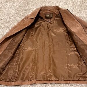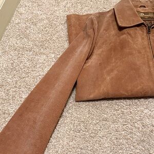Stylish brown suede leather jacket by Free Country. Perfect for any occasion. Comfortable and stylish. Functional zipper. Some fading from hanging on hanger (sleeves, shoulders, collar) as shown. Yellowstone vibes!