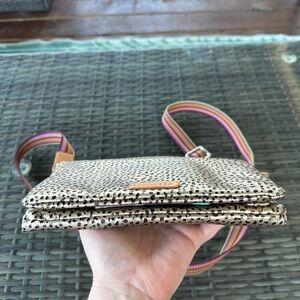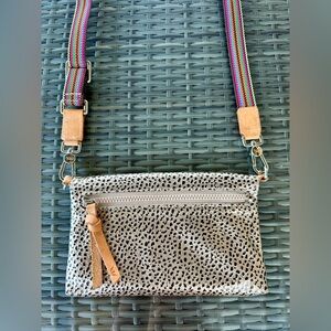 Used Consuela wristlet in cream and black. Features a vibrant multicolor strap. Ideal for versatile styling.