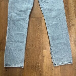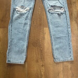 Super cute American Eagle 90s Straight jeans in a light wash with distressed knee details. These have that relaxed vintage look that’s super in right now.