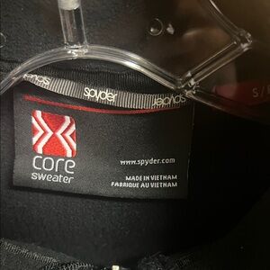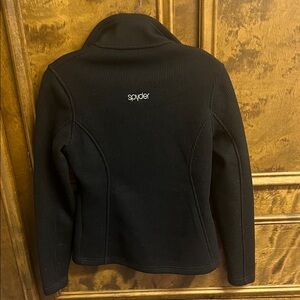 Sleek black design with Spyder logo. Ideal for skiing and snow activities. Offers warmth and style. Two front pockets. Great condition.